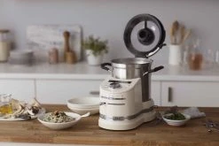 Die Küchenhilfe CookProcessor von KitchenAid verfügt über diverse Funktionen: Zerkleinern, Zerquetschen, Zerhacken, Hacken, Vermengen, Mixen, Schlagen, Emulgieren, Kneten, Dämpfen, Kochen, Schmoren, Braten. Weiterhin verfügt die Küchenmaschine über sechs automatische Modi: Kochen, Braten, Pürieren, Teig kneten, Dämpfen, Schmoren. Nach dem Einprogrammieren geht die Anwendung leicht von der Hand. Die dicke Aluminiumkochplatte, die bis zu 140 °C erhitzt und exakt eingestellt werden kann, garantiert gleichmäßige Temperaturen. Das ist Kochen nach Wunsch.