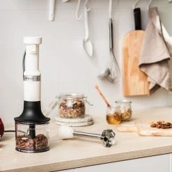 Mit diesem Stabmixer mit Zubehör können Sie viele kulinarische Leckereien zaubern. Sie können schnell und mühelos mixen, mischen, zerkleinern, pürieren, verquirlen, aufschäumen und schlagen. Bereiten Sie alle möglichen Rezepte und Gerichte zu – von Suppen oder Smoothies bis hin zu Babynahrung und Saucen. Das perfekte Pesto, eine fruchtige Salsa oder frische Mayonnaise – es wird alles zum Kinderspiel. Der Stabmixer wird mit einem BPA-freien 1 l Behälter mit Deckel und Griff geliefert, sodass Sie in nur einem Behälter abmessen, zubereiten, servieren und aufbewahren können. Der Mischerarm verfügt über einen abnehmbaren Pfannenschutz, mit dem Sie Ihre Töpfe und Pfannen vor Kratzern schützen können. Mit dem mitgelieferten Schneebesen können Sie Sahne schlagen oder Vinaigrette mischen, und mit dem praktischen Zerkleinerer können Sie Nüsse, Zwiebeln, Knoblauch, Kräuter und mehr verarbeiten. Dank des Startschalters zur Geschwindigkeitsanpassung können Sie die gewünschten Ergebnisse sogar einhändig erreichen.