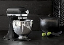 Die Schüssel im Retro-Look aus gehämmertem Edelstahl verleiht Ihrer Küche Eleganz und Klasse. Mit 4,8 L Fassungsvermögen ermöglicht sie die Herstellung von mittelgroßen Teigmengen. Abgerundet wird das Premiumpaket durch die drei Rühraufsätze.