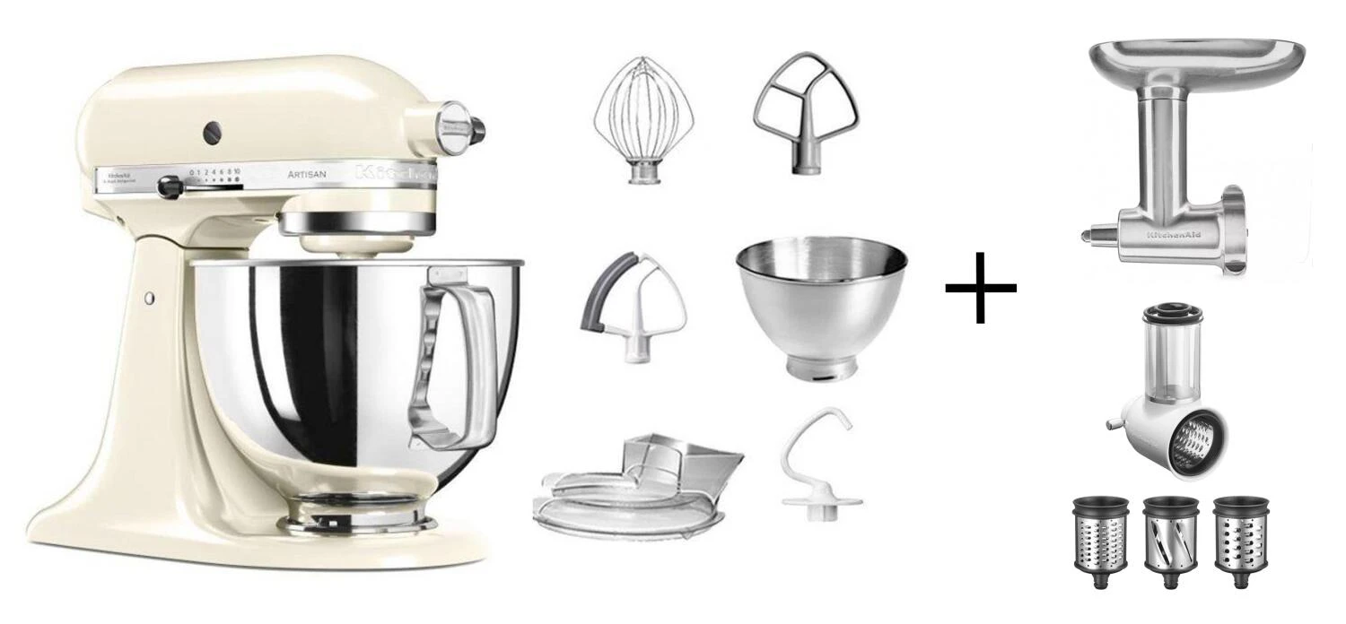 KitchenAid Küchenmaschine ARTISAN 175PS Kochprofi-Set in creme mit Gemüseschneider und Fleischwolf aus Metall.