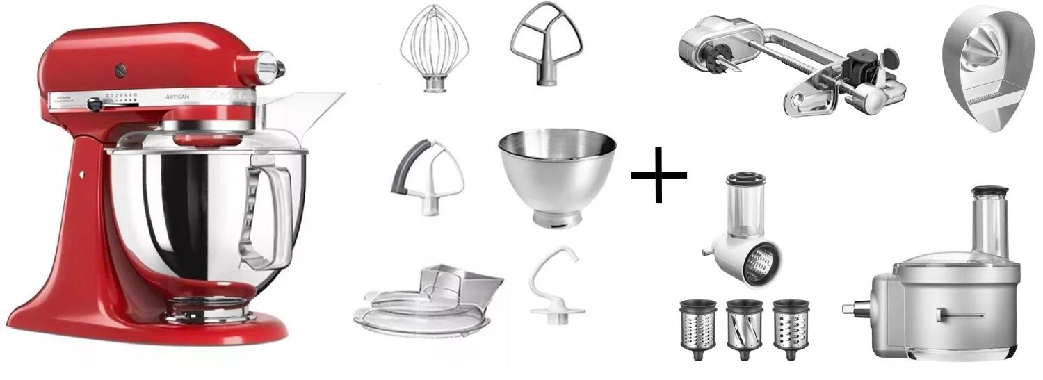 KitchenAid Küchenmaschine ARTISAN 175PS Fitness-Set in empire rot mit Spiralschneider, Food-Processor-Vorsatz, Gemüseschneider und Zitruspresse.