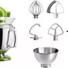 - Lieferumfang: Küchenmaschine, Schüssel 4,8 Liter, Schneebesen, Knethaken, Flachrührer, Flexirührer Spritzschutz mit Einfüllschütte