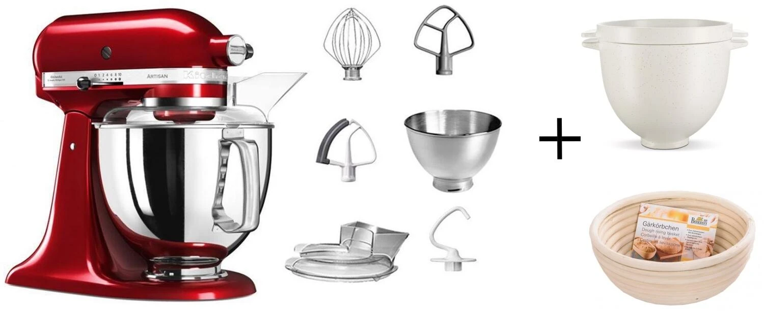 KitchenAid Küchenmaschine ARTISAN 175PS Brotback-Set in liebesapfelrot mit Brot-Backschüssel und Gärkörbchen aus Peddigrohr.
