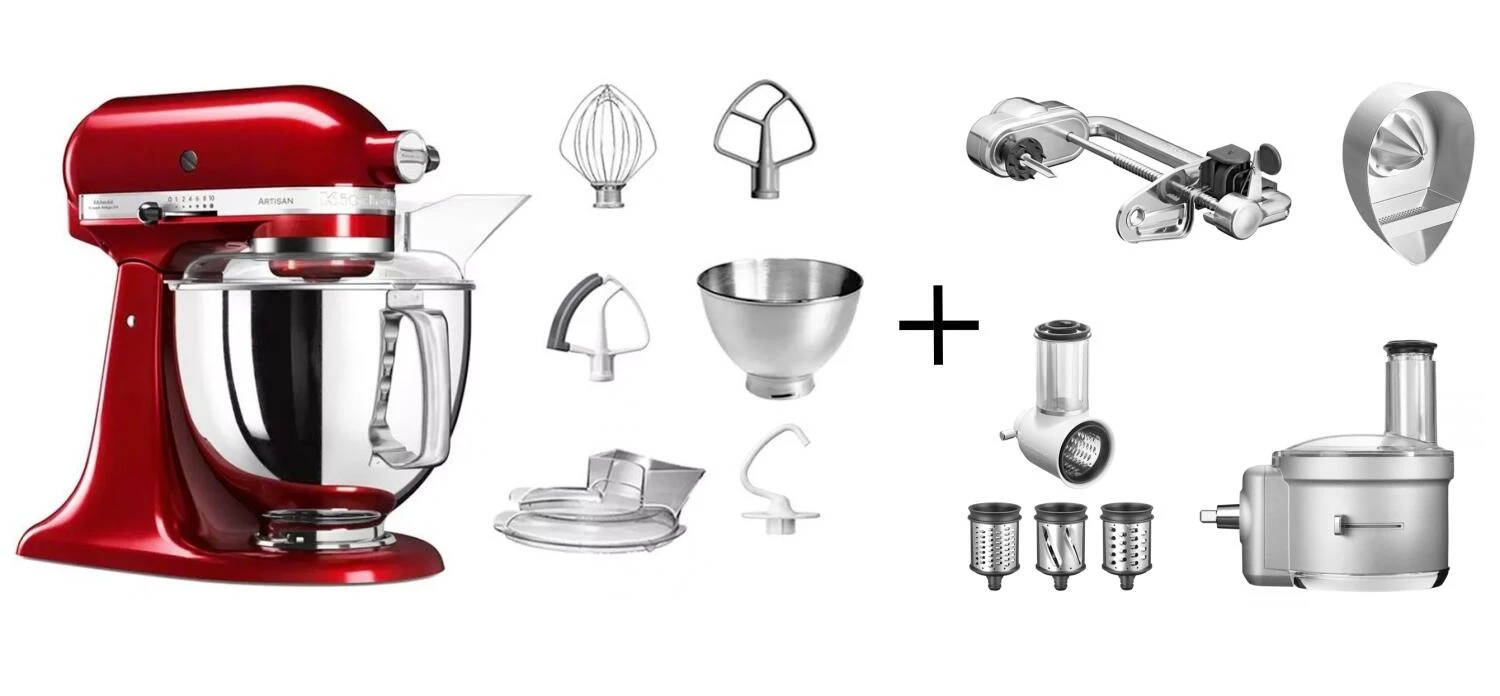 KitchenAid Küchenmaschine ARTISAN 175PS Fitness-Set in liebesapfelrot mit Spiralschneider, Food-Processor-Vorsatz, Gemüseschneider und Zitruspresse.