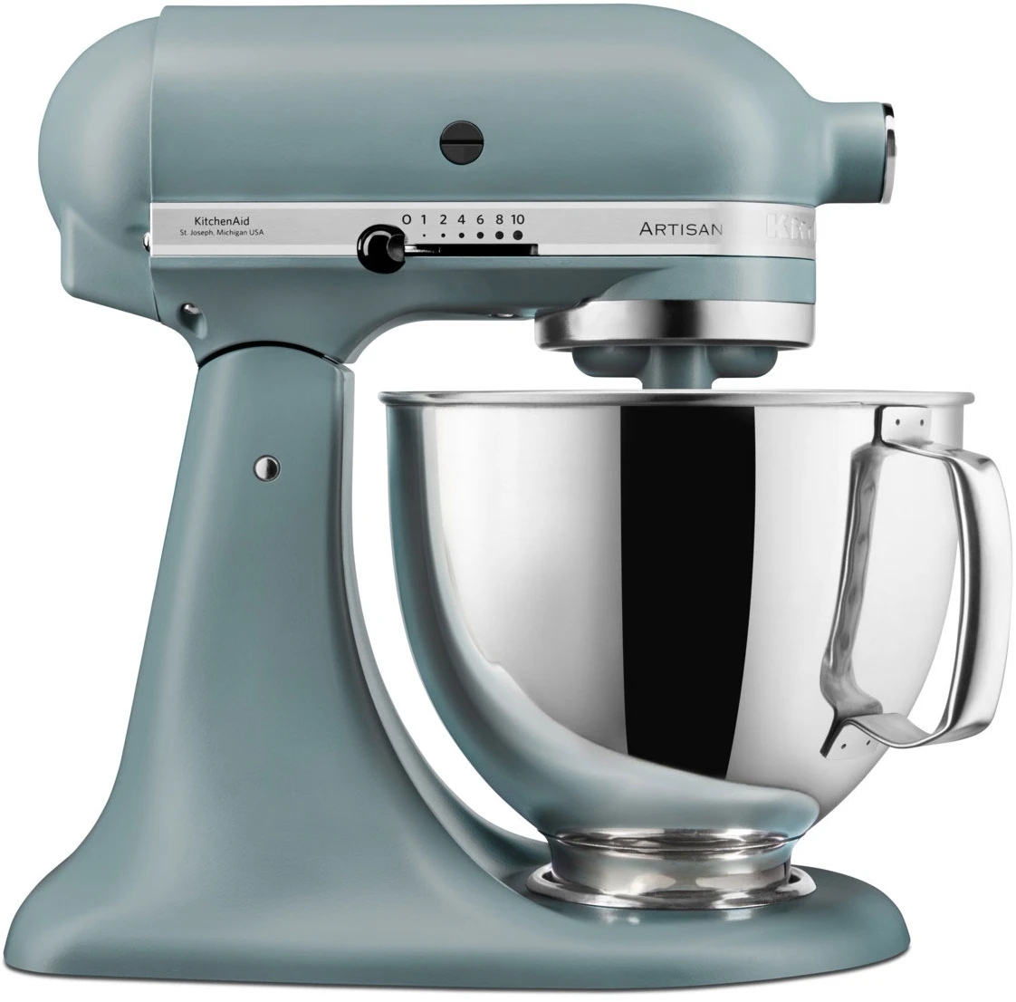 KitchenAid Küchenmaschine ARTISAN 175PS Fitness-Set in nebelblau mit Spiralschneider, Food-Processor-Vorsatz, Gemüseschneider und Zitruspresse.