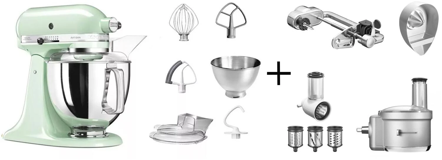 KitchenAid Küchenmaschine ARTISAN 175PS Fitness-Set in pistazie mit Spiralschneider, Food-Processor-Vorsatz, Gemüseschneider und Zitruspresse.
