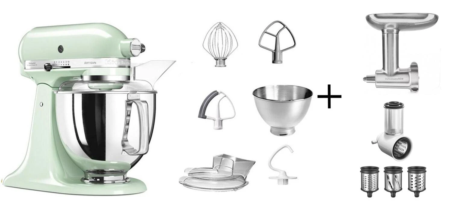 KitchenAid Küchenmaschine ARTISAN 175PS Kochprofi-Set in pistazie mit Gemüseschneider und Fleischwolf aus Metall.