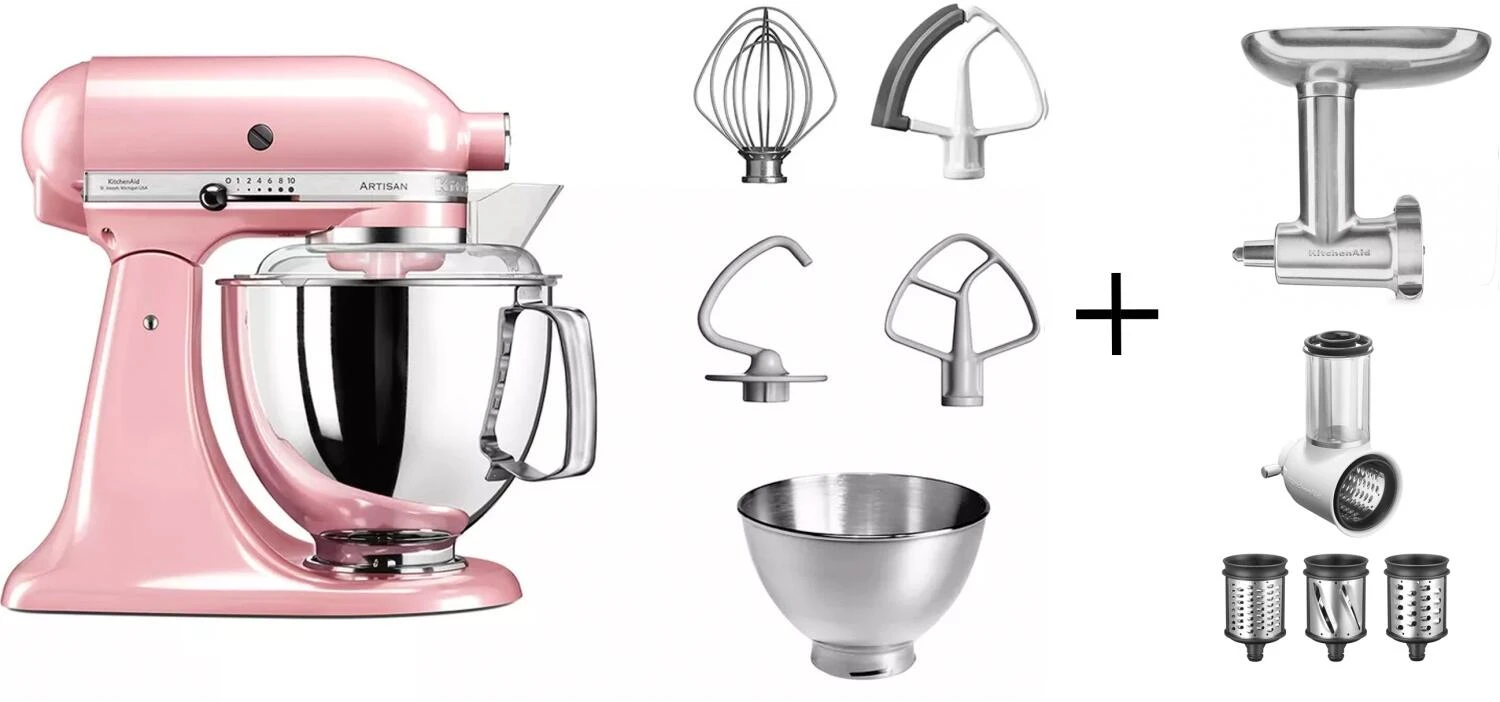 KitchenAid Küchenmaschine ARTISAN 175PS Kochprofi-Set in seidenpink mit Gemüseschneider und Fleischwolf aus Metall.