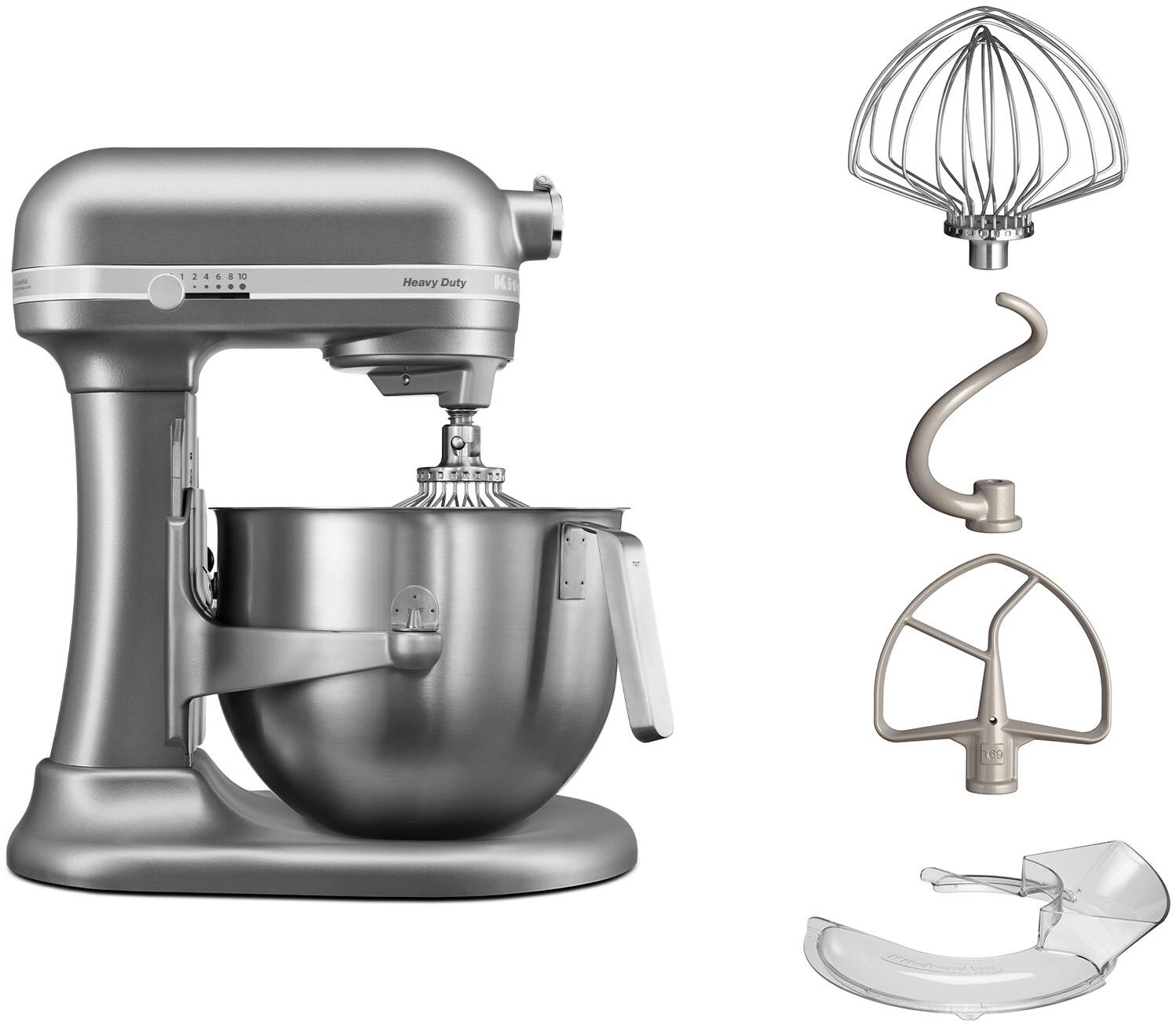 - Standardzubehör (im Lieferumfang enthalten): 6,9 L Schüssel aus gebürstetem Edelstahl, Spritzschutz, elliptischer Schneebesen mit 11 Drähten aus Edelstahl, Knethaken aus Aluminium, Flachrührer aus Aluminium