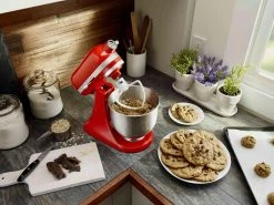 Die Mini-Küchenmaschine von KitchenAid ist 25 Prozent leichter und 20 Prozent kleiner als seine klassischen Vorgänger. Ausgestattet mit dem typischen Kippmotor, Edelstahl-Schüssel mit 3,3 Liter Füllmenge und 250 W Leistung per Gleichstrommotor mit Direktantrieb steht sie den klassischen Küchenmaschinen jedoch in Nichts nach.